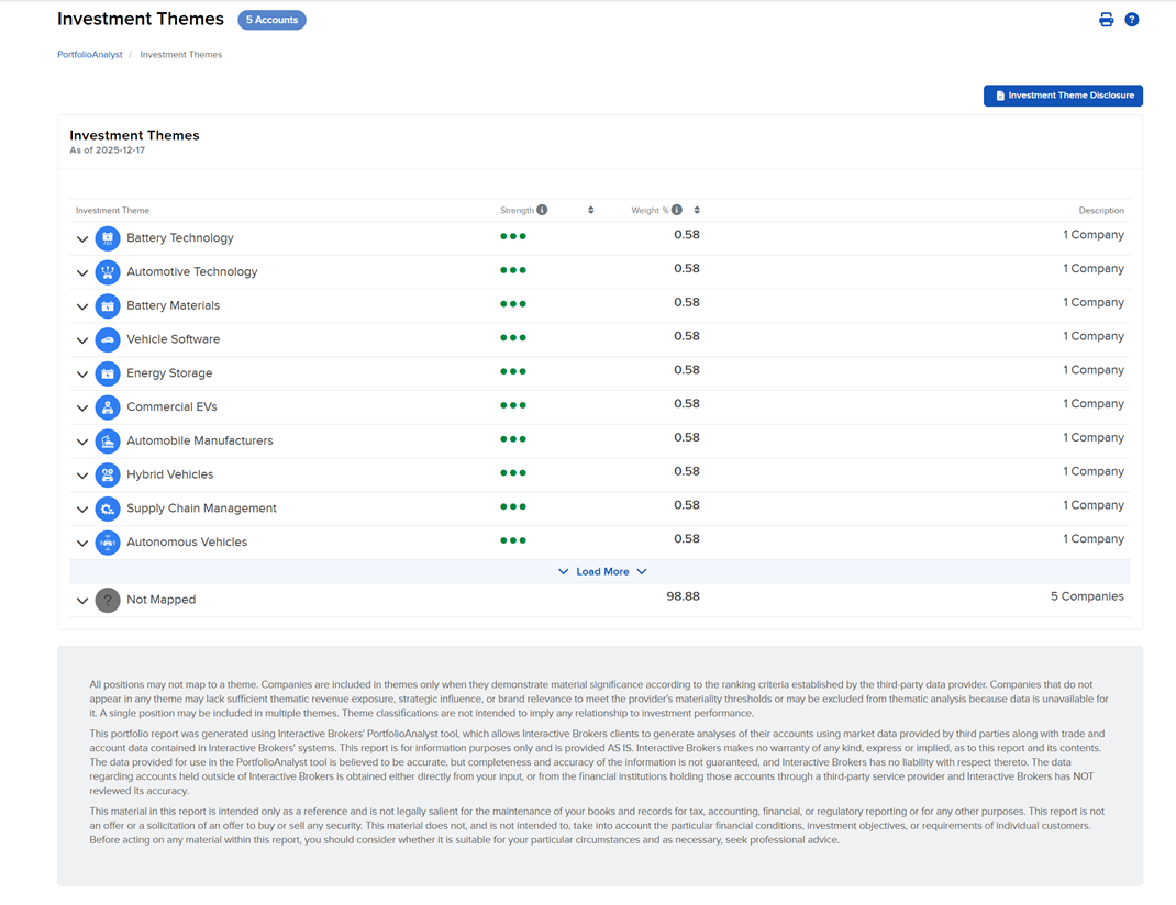 Click the arrow next to any Investment Theme to expand it and see your holdings, including the Description, Weight %, Unrealized %, and Unrealized P&L.