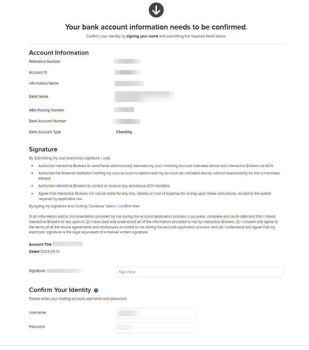 To use this method, you must first create a standing instruction through Transfer & Pay authorizing IBKR and your bank to electronically transfer funds between the two accounts. You will be asked to verify your bank in one of two ways:
