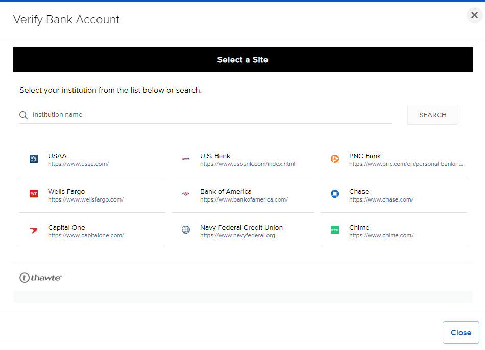 • Log in at your bank - Select your bank and enter your username and password to verify your credentials immediately.