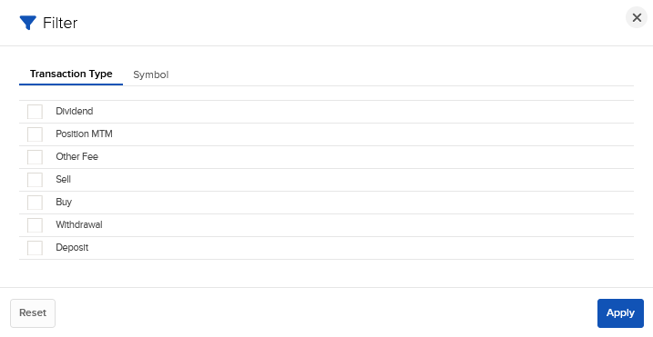 Click the filter icon to filter the page by Transaction Type or Symbol.