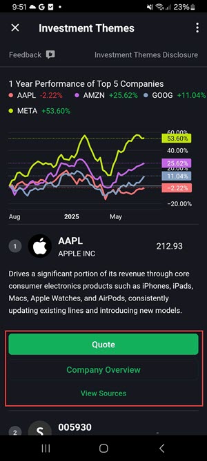 You can then explore Investment Themes and other connections to the selected company, and even dive down in to a specific Theme by tapping Investment Theme Overview.