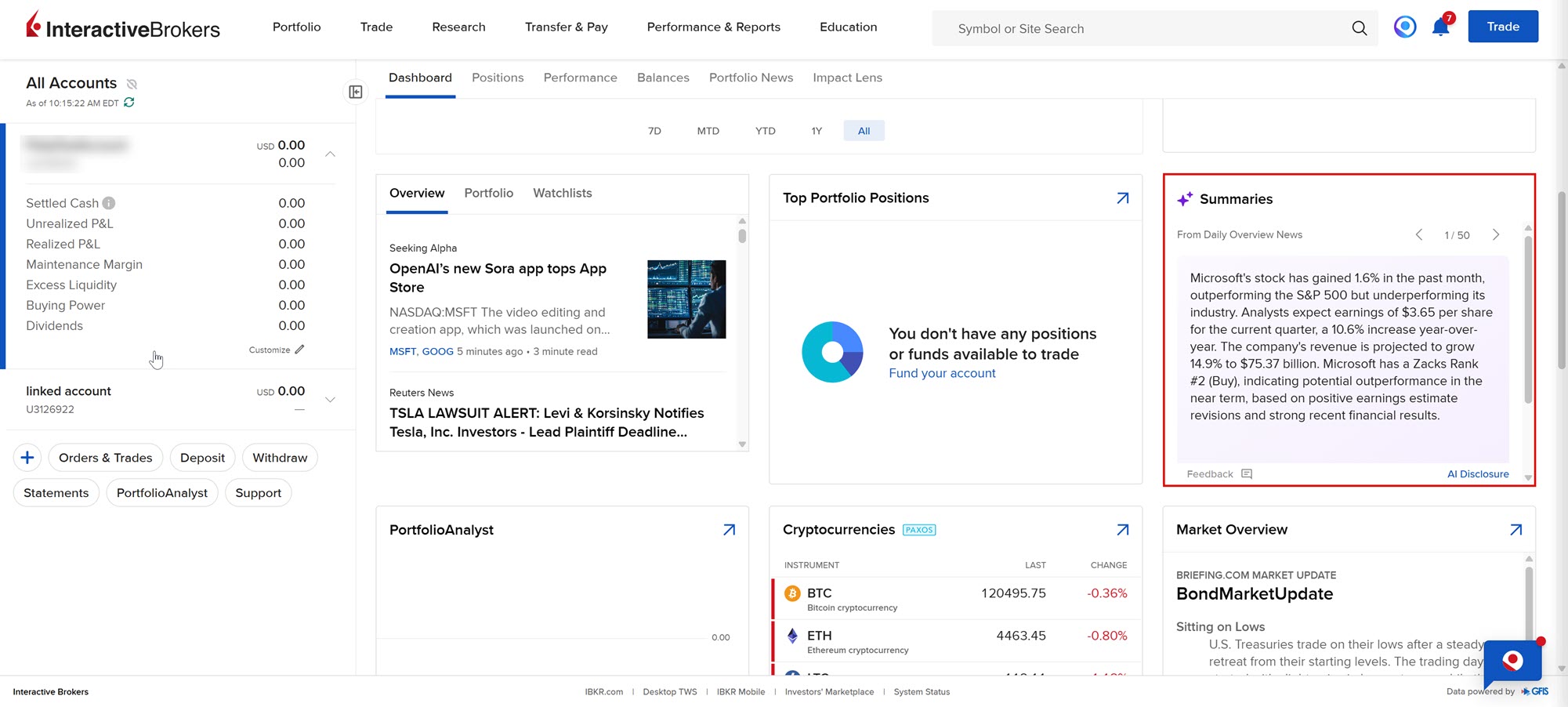 We offer an AI-generated news summary which allows clients to access concise summaries of news articles, streamlining insights from leading providers, and making it easier for investors to stay informed. The AI generated news summaries feature is available to eligible clients of IB affiliates listed below.
