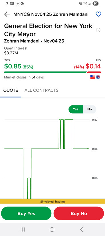 To trade a forecast contract, select the contract and click Buy No or Buy Yes