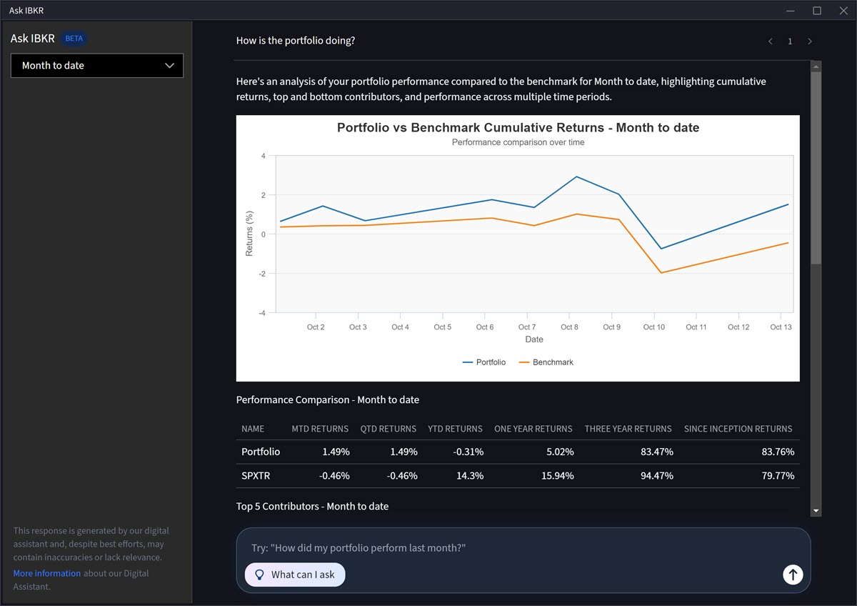 Ask IBKR is an AI-powered tool that delivers instant portfolio insights through natural language inquiries. Categories of queries include: