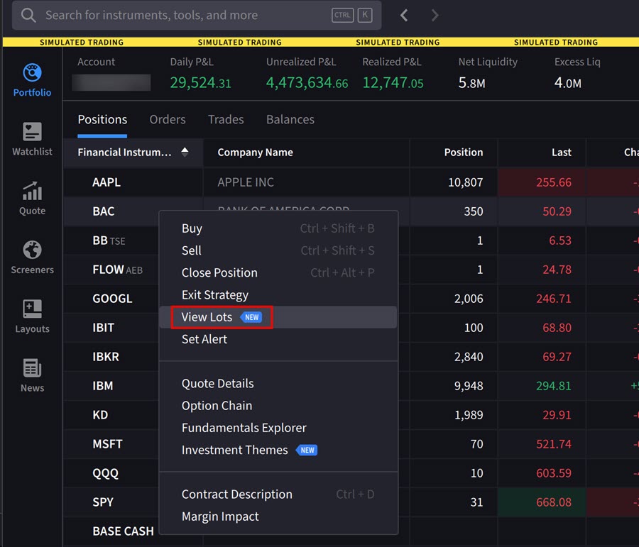 Traders can now multi-select tax lots and place closing orders directly from the View Lots window. To use this tool, right-click on a position in your portfolio and select View Lots. The Lots screen will populate. Select Close Specific Lots and select the lots that you would like to close. Select Create Order to close these orders.