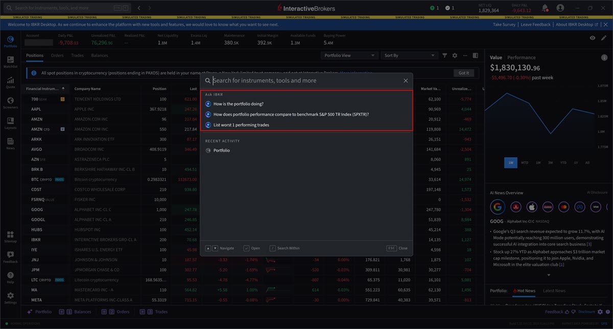 Click the Search bar in the top left corner of any screen. The Ask IBKR section will appear with a populated list of questions. Click one of these questions, or search for additional portfolio insights.
