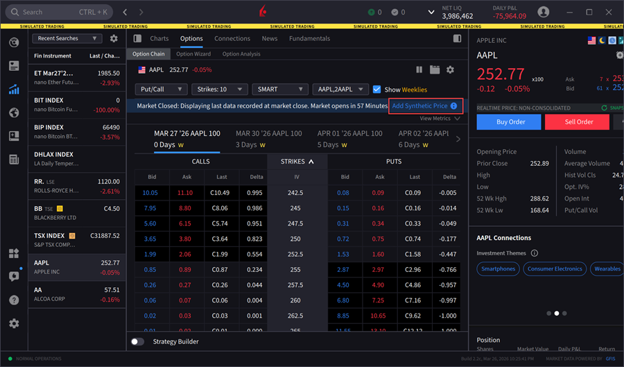 We have added the Synthetic Price calculation in Option Chain. This uses an algorithm that incorporates market data and option details to estimate implied volatility and generate a theoretical option price. Inputs to the algorithm include but are not limited to the underlying asset price, interest rates, dividends estimates, option right, strike price, time to expiration, and volatility estimate. The synthetic price is updated continuously as market conditions change.