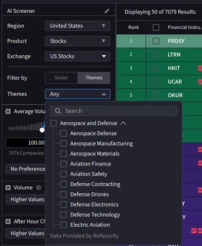 A list of companies related to the specified Theme will populate in the screener.