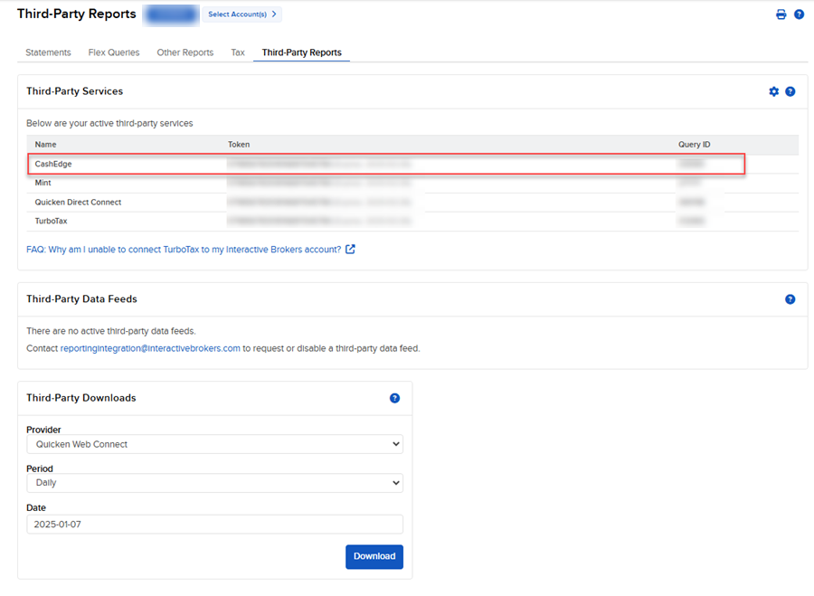 To retrieve the Token and Query ID, log into the account you are attempting. This will be located under Performance and Reports > Third Party Reports.