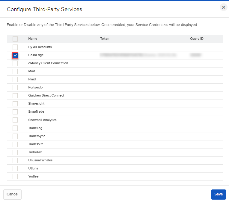 If you do not see CashEdge under Third Party Reports, you may add it by selecting the configure wheel icon in the top right corner of Third-Party Services and clicking the check box to the left of CashEdge.