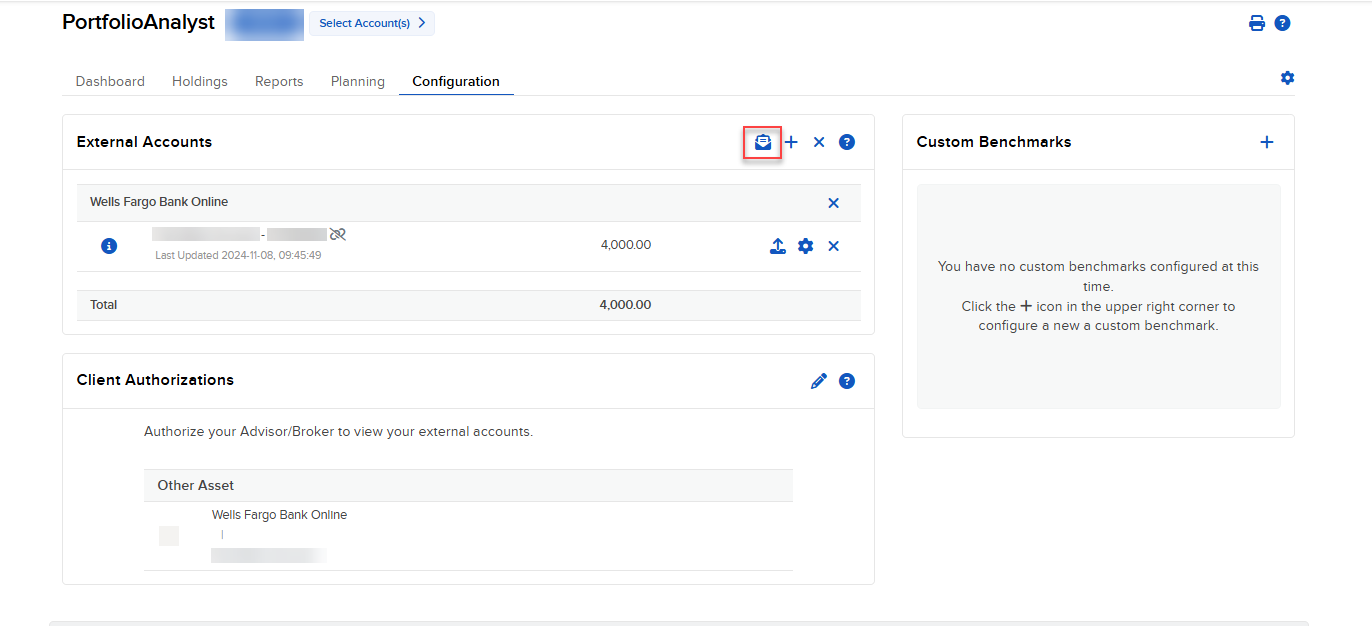 Click the Configuration tab and select the Client Invite icon in the top right corner of the External Accounts panel.