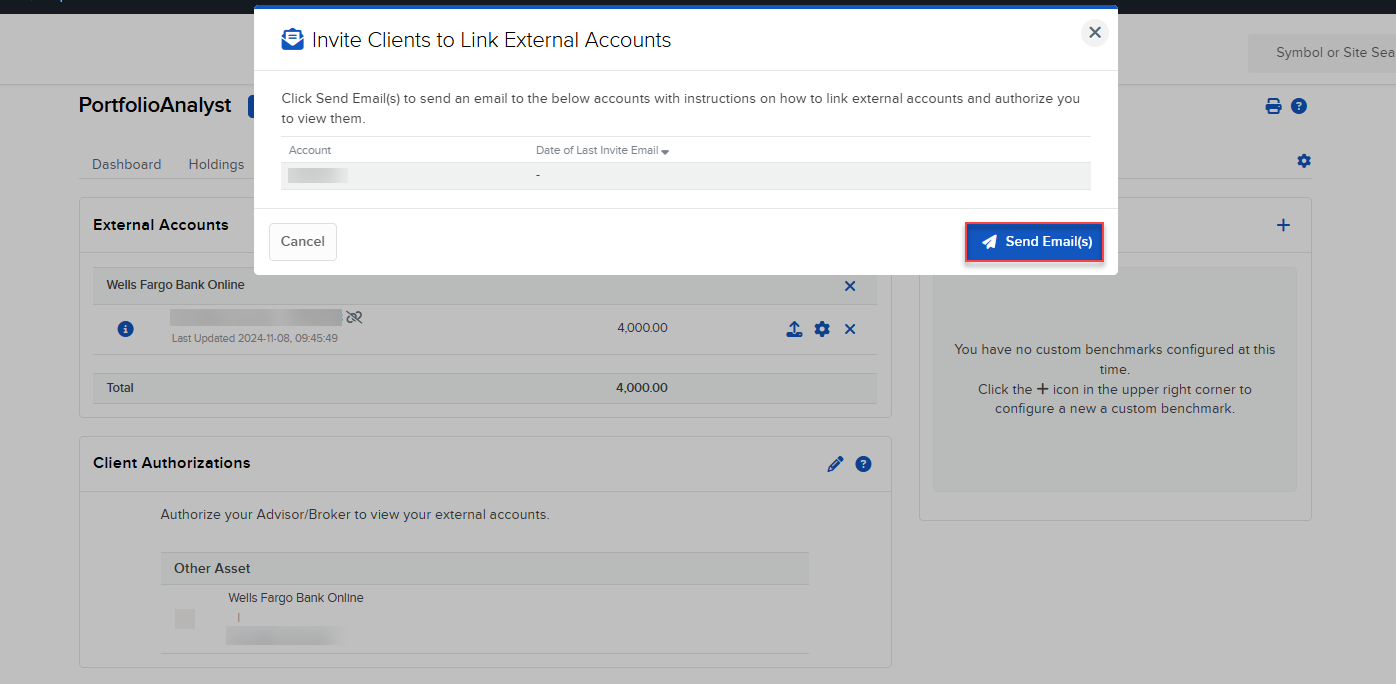 Click the Send Emails button to send an email to the listed client with instructions on how to link external accounts and authorize you to view them.