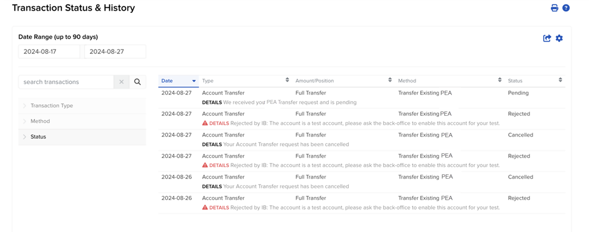 7. Click a pending transaction from the transaction list to view, cancel, or upload documents.