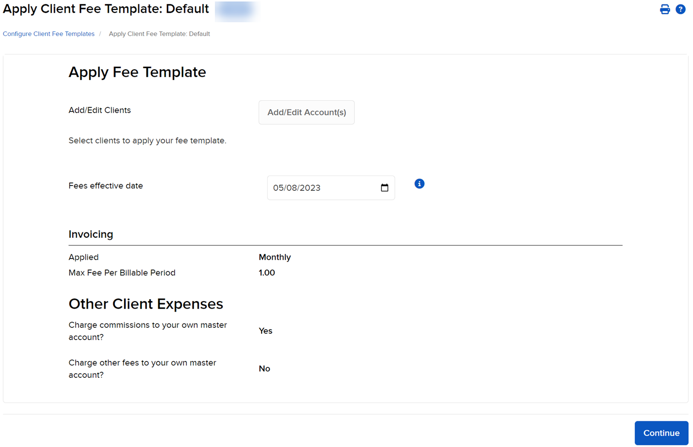 - The Apply Fee Template page now lists the accounts you have chosen. Click Continue.