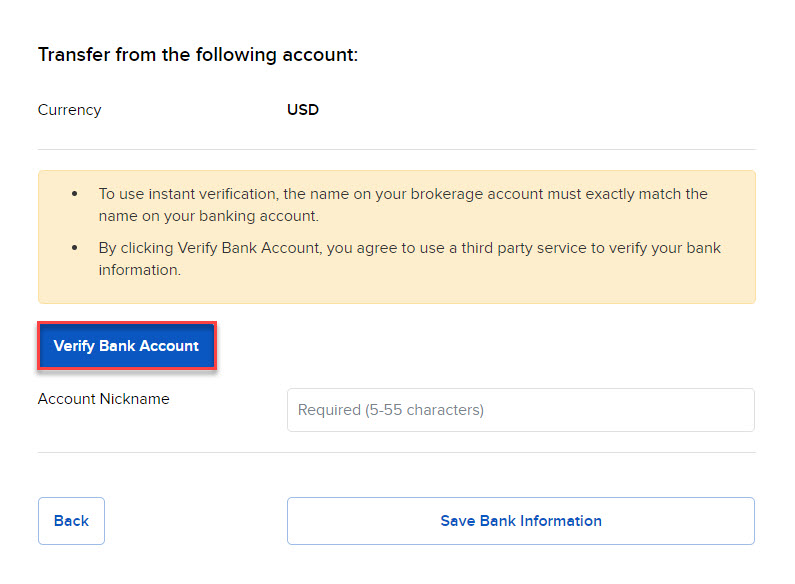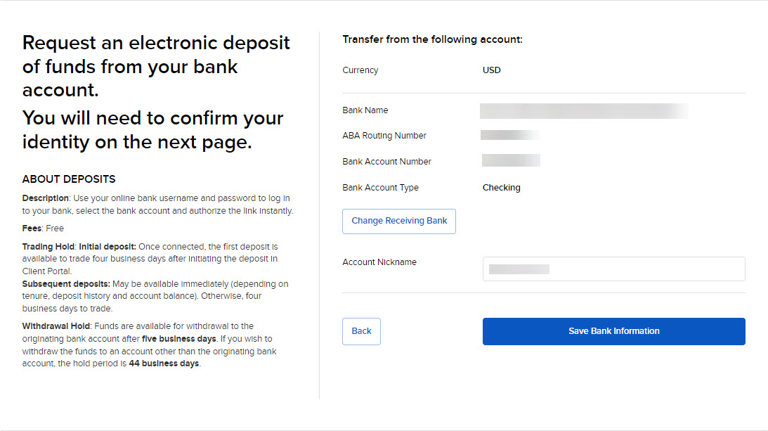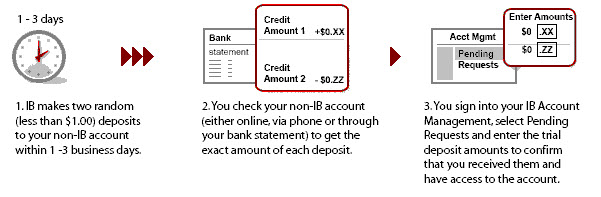To use this method, you must first create a standing instruction through Transfer & Pay authorizing IBKR and your bank to electronically transfer funds between the two accounts. You will be asked to verify your bank in one of two ways: