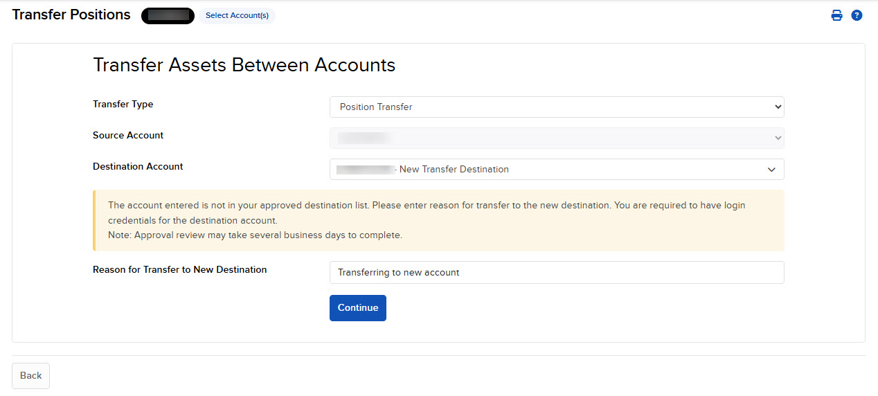 Select a Transfer Type (Position Transfer, Cash Transfer, or Full Account Transfer). Then, select the Destination Account and press Continue.