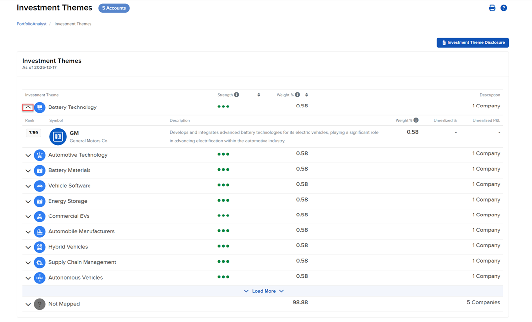 Click the arrow next to any Investment Theme to expand it and see your holdings, including the Description, Weight %, Unrealized %, and Unrealized P&L.