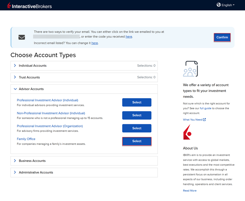 Confirm your email address by selecting the blue Confirm button in the top right corner. Select the Advisor Account tab followed by Family Office from the account type drop-down menu.
