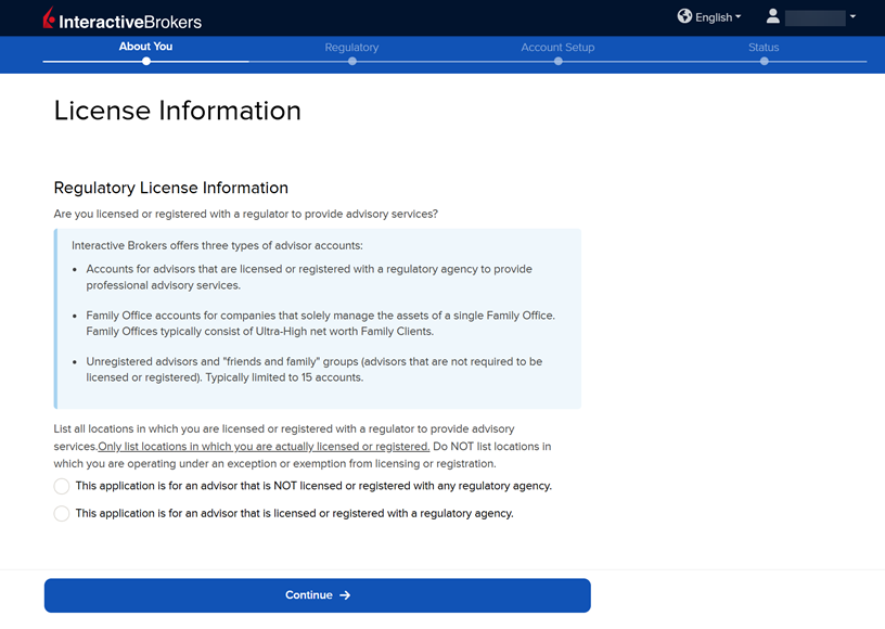 Enter the Regulatory License Information by selecting "This application is for an advisor that is NOT licensed or registered with any regulatory agency" or "This application is for an advisor that is licensed or registered with a regulatory agency".