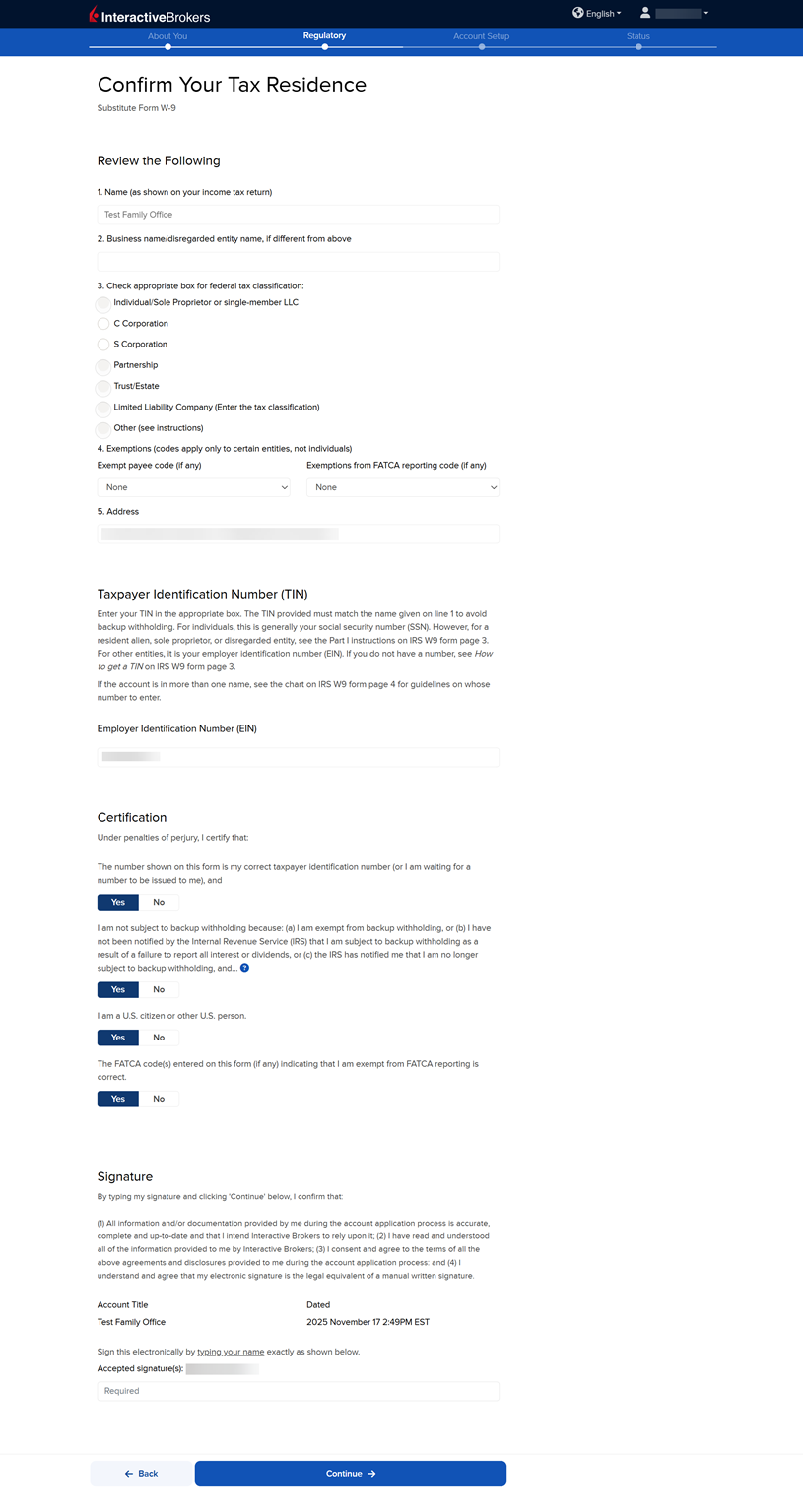 The following page asks you to Confirm Your Tax Residency. Fill this out accordingly and press Continue.