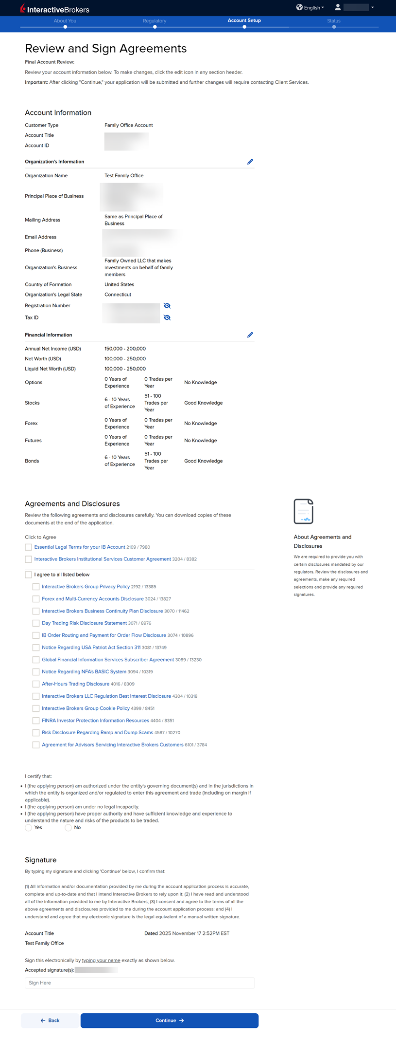 The next page of the application is the Review & Sign Agreements section. Fill this out accordingly and press Continue.