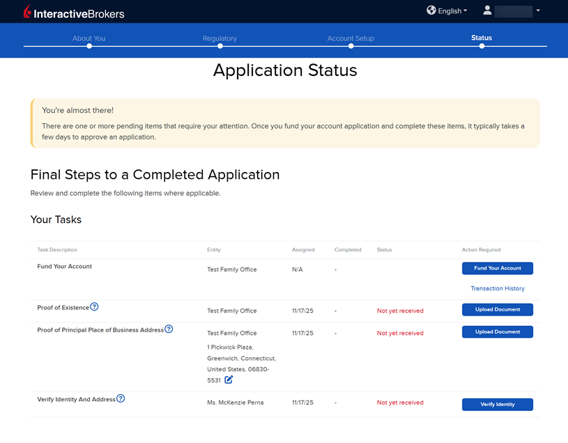The final page of the application is the Status section. This page will state any additional information or documents needed to complete the application. These tasks are prompted based on the information you previously provided in the application. Any required documents needed for the application will be marked as "REQUIRED" or "Not Yet Received" in red letters. Select the blue buttons to Fund Your Account, Answer Questions, Verify Identity, and Upload Documents.