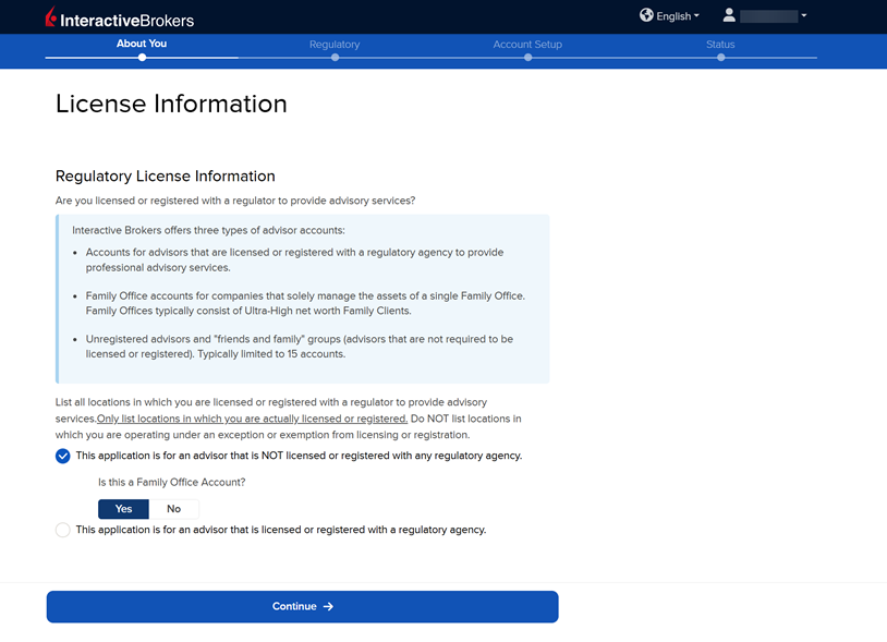 If you select "This application is for an advisor that is NOT licensed or registered with any regulatory agency" you must select Yes or No to "Is this a Family Office Account?"