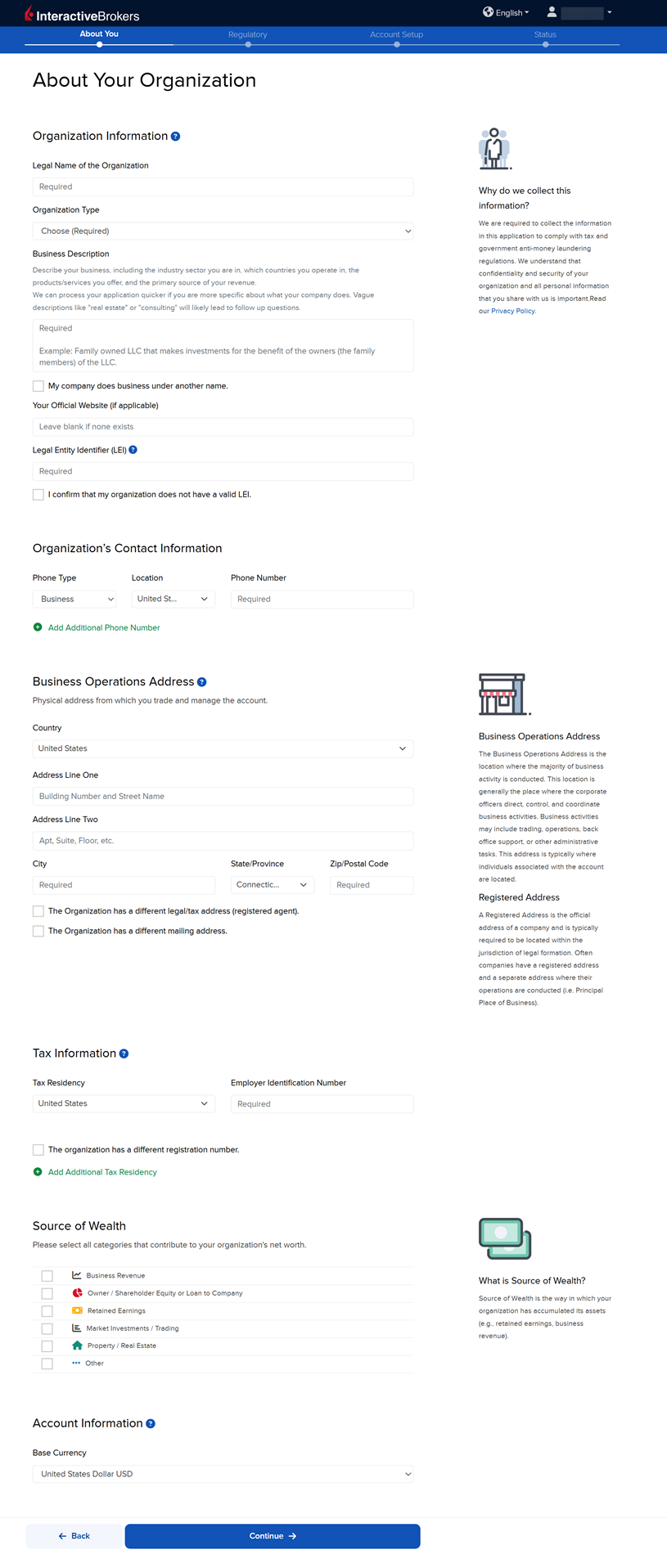 The next page of the application is the About Your Organization section. Fill this out accordingly and press Continue.