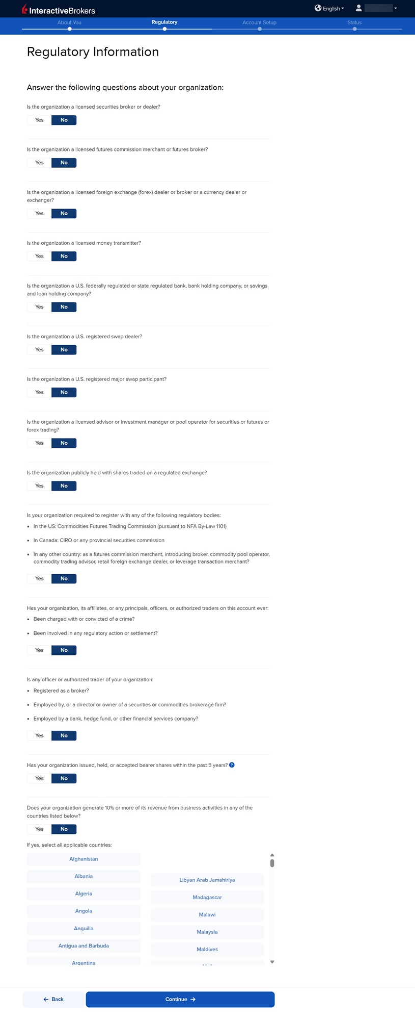 The following page of the application is the Regulatory Information section. Fill this out accordingly and press Continue.