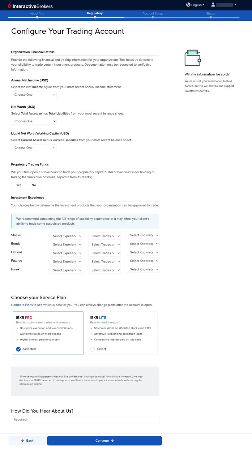 The next page of the application is the Configure Your Trading Account section. Fill this out accordingly and press Continue.