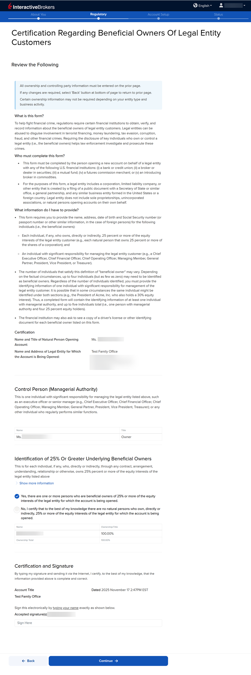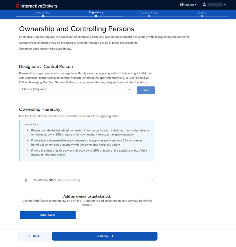 The following page asks you to add information on Ownership and Controlling Persons. Fill this out accordingly and press Continue. Please note, after entering an individual's information you need to navigate back to that section and add a percentage of ownership.