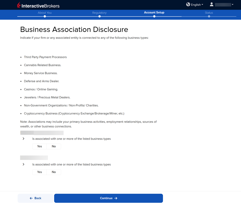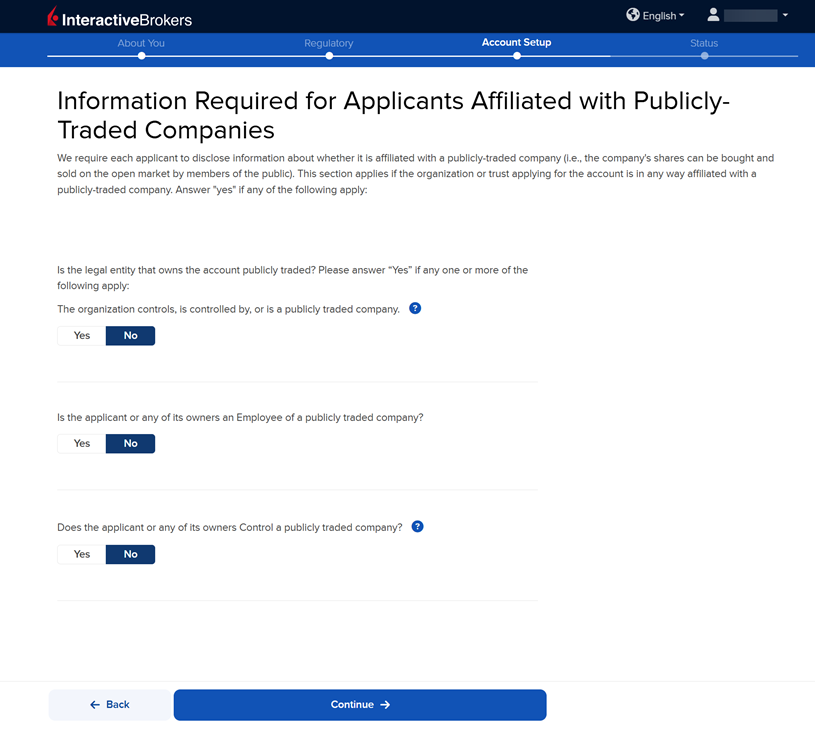 The next page of the application is the Information Required for Applications Affiliated with Publicly-Traded Companies section. Fill this out accordingly and press Continue.