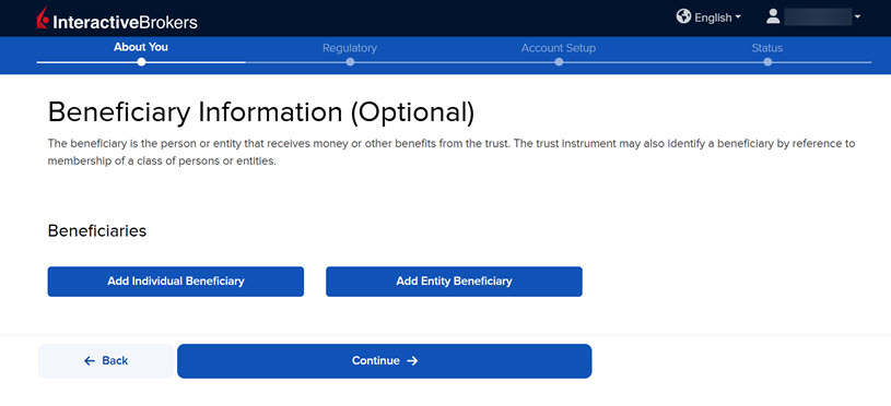 Complete the About You section and press Continue. Choose the Trust Account Type (listed below). Any additional questions specific to that account type will appear.