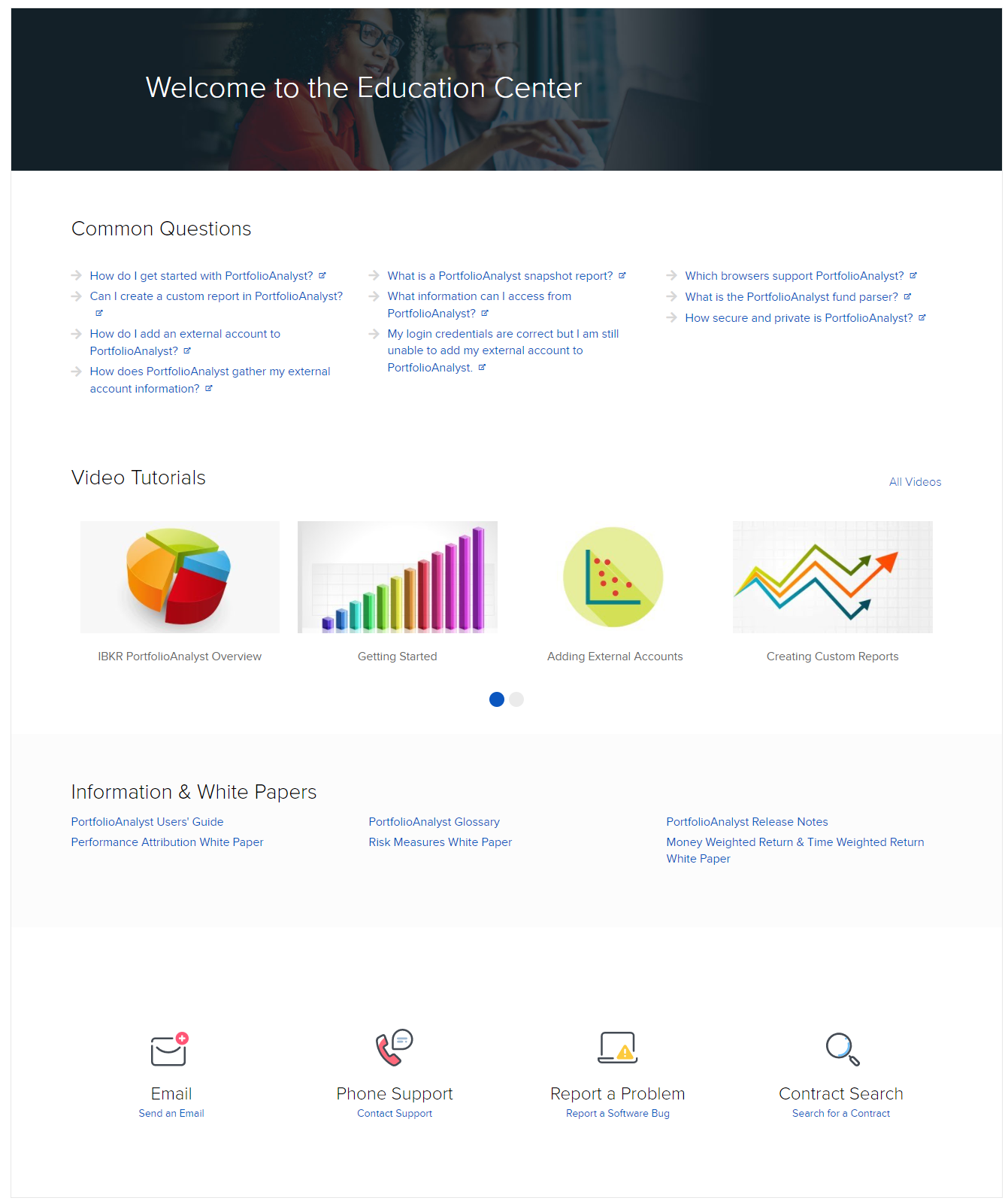 The Education Center page provides quick links and access to help and documentation resources. The resources include the FAQ, Users' Guide, White Papers, Traders' Academy and Release Notes.