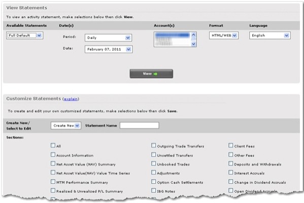 Information included in an Activity Statement is presented in expandable and collapsible sections with click-down detail. There are three default statements to choose from, but you can also create your own customized statements to include or exclude individual sections as well as set various other options.