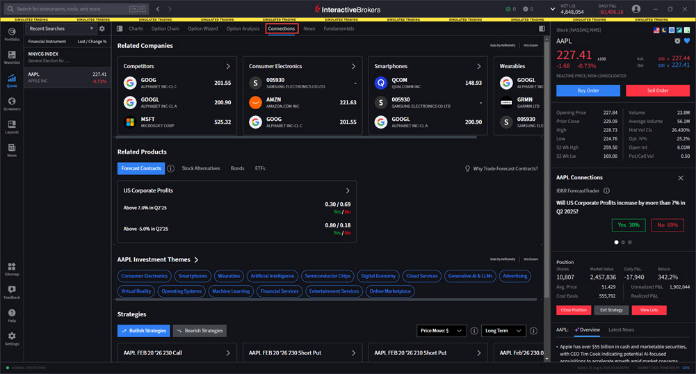 Explore a new way to discover opportunity. The Connections tab surfaces stocks, ETFs, futures, and other instruments closely tied to what you’re viewing. Whether you're looking for related instruments or tradeable strategies, the Connections tab brings relevant connections to the forefront—right when you need them.