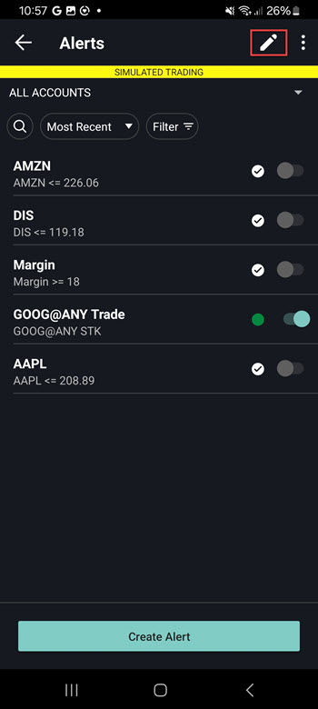The Alerts page will populate. Select the pencil icon in the top right corner.