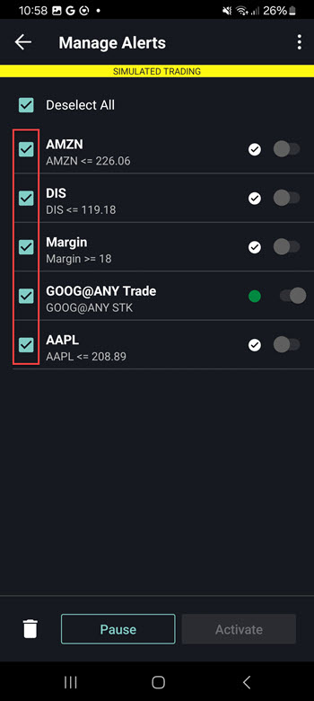 Select the check box's to the left of the alerts you would like to Delete, Pause, or Activate.