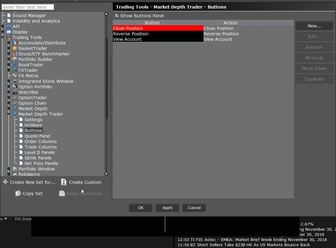 To create a set that can be used for a specific instrument, for example AAPL stock, from Global Configuration select Market Depth Trader in the left pane. Select Buttons. Click Create New Set for... and select Stocks (or select the Stocks set if already created). Click Create Ticker-Specific and enter a symbol, for example AAPL. The new set is displayed in the right pane and by default includes the Close Position, Reverse Position View account buttons. Click Add Button to create a button. Select the action, and in the Button Appearance section uncheck Generate label to customize the button label in the Button text field. Click OK to add the button to the set. Easily Duplicate, Edit, Delete and rearrange buttons by holding your mouse over a button and using the displayed menu. To reorder a button, click and hold the move icon and drag the button to its new location in the list. Back in Market Depth Trader use the Button Set drop down to select Auto. If you have selected AAPL, that set of buttons will be displayed.