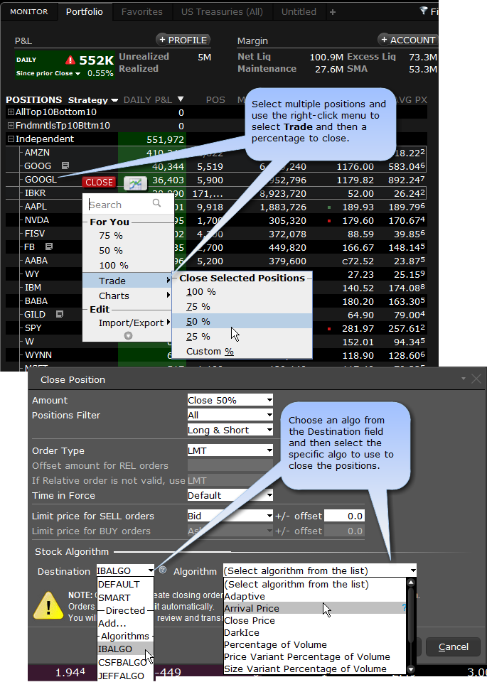 Elect to close multiple positions by selecting positions from your portfolio and using the right-click menu to select Trade, then the percentage of positions to close.