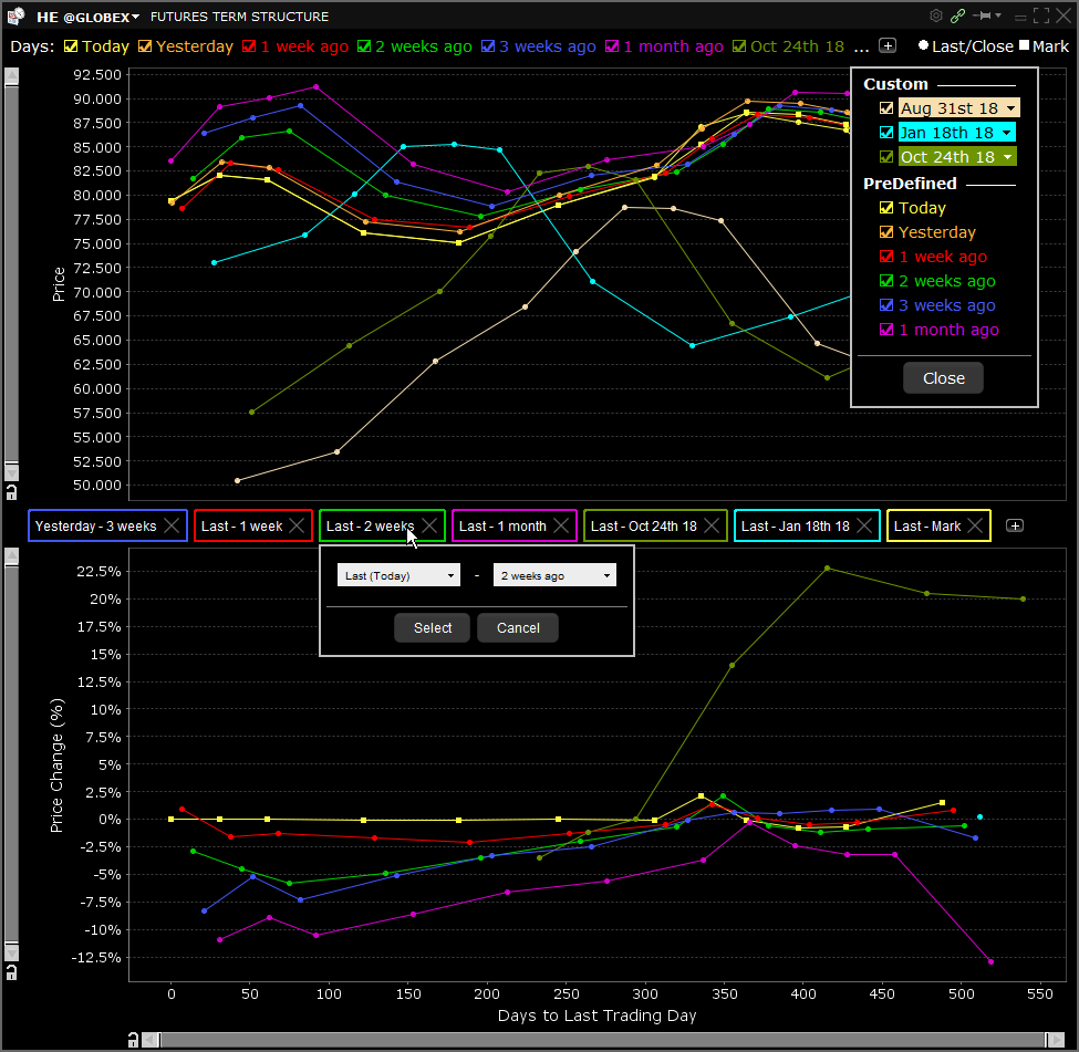 View the real-time and historical term structure of futures prices with the new Futures Term Structure window. Replacing the web-based tool, this window displays a split chart that shows the real-time and historical settlement prices of the existing futures contracts for the given underlying (top chart) and the differences between the older settlement price curves and the most recent selected curve (bottom chart).